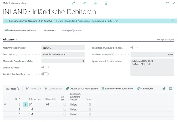 Mit der Einführung von Microsoft Dynamics 365 Business Central 27 erfährt das Mahnmodul einige Anpassungen, die Anwenderfreundlichkeit und Übersichtlichkeit deutlich verbessern. Die bekannte Funktionalität bleibt bestehen, wird aber in einem optimierten Layout dargestellt. Besonders die Einrichtung von Mahnstufen, Mahnmethoden und Mahnfristen ist jetzt klarer und intuitiver aufgebaut.