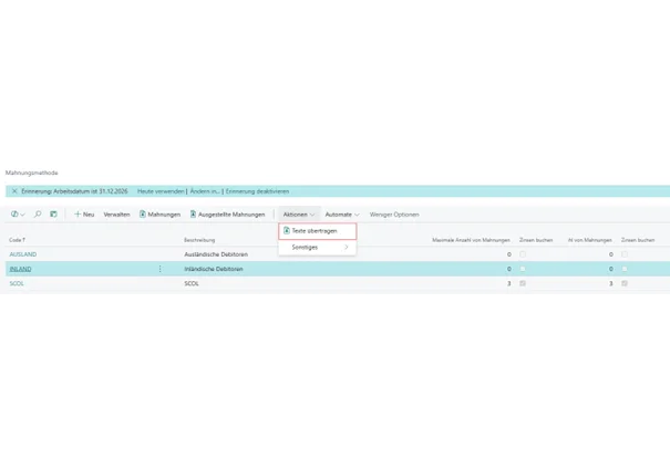 Nach der Aktivierung der neuen Funktionsweise sollte in den Mahnmethoden die Funktion „Texte übertragen“ ausgeführt werden. Anschließend empfiehlt es sich, die übernommenen Texte sorgfältig zu prüfen. Eine Datensicherung der Vor- und Nachtexte vor der Umstellung ist ratsam, um im Bedarfsfall eine Wiederherstellung durchführen zu können.